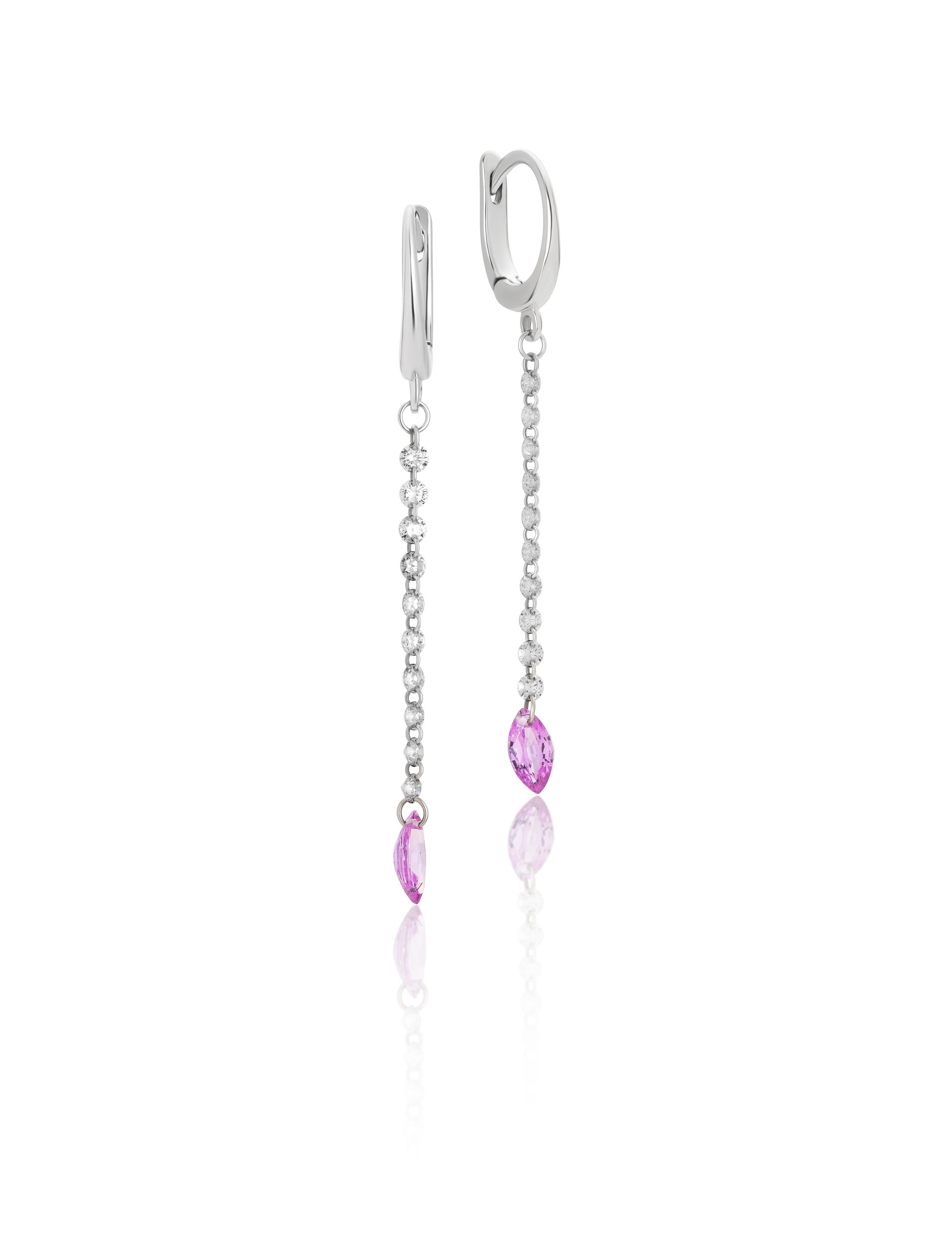 Orecchini in oro bianco 18KT gr 1,62 con diamanti naturali ct 0,48 (0,023 punti l'uno) e zaffiri rosa naturali taglio marquise ct 0,53.