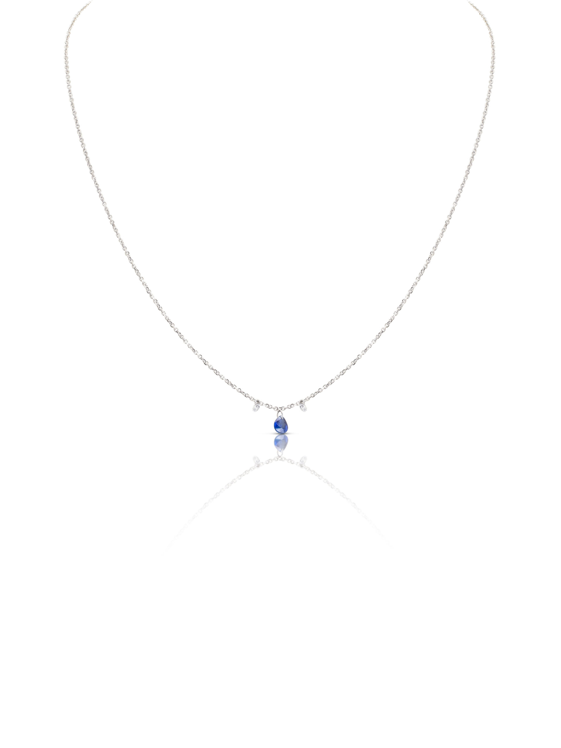 Collana in oro bianco 18Kt gr 1,50 con diamanti naturali ct 0,10 e zaffiro blu naturale taglio goccia ct 0,31. Disponibile in tutte le carature