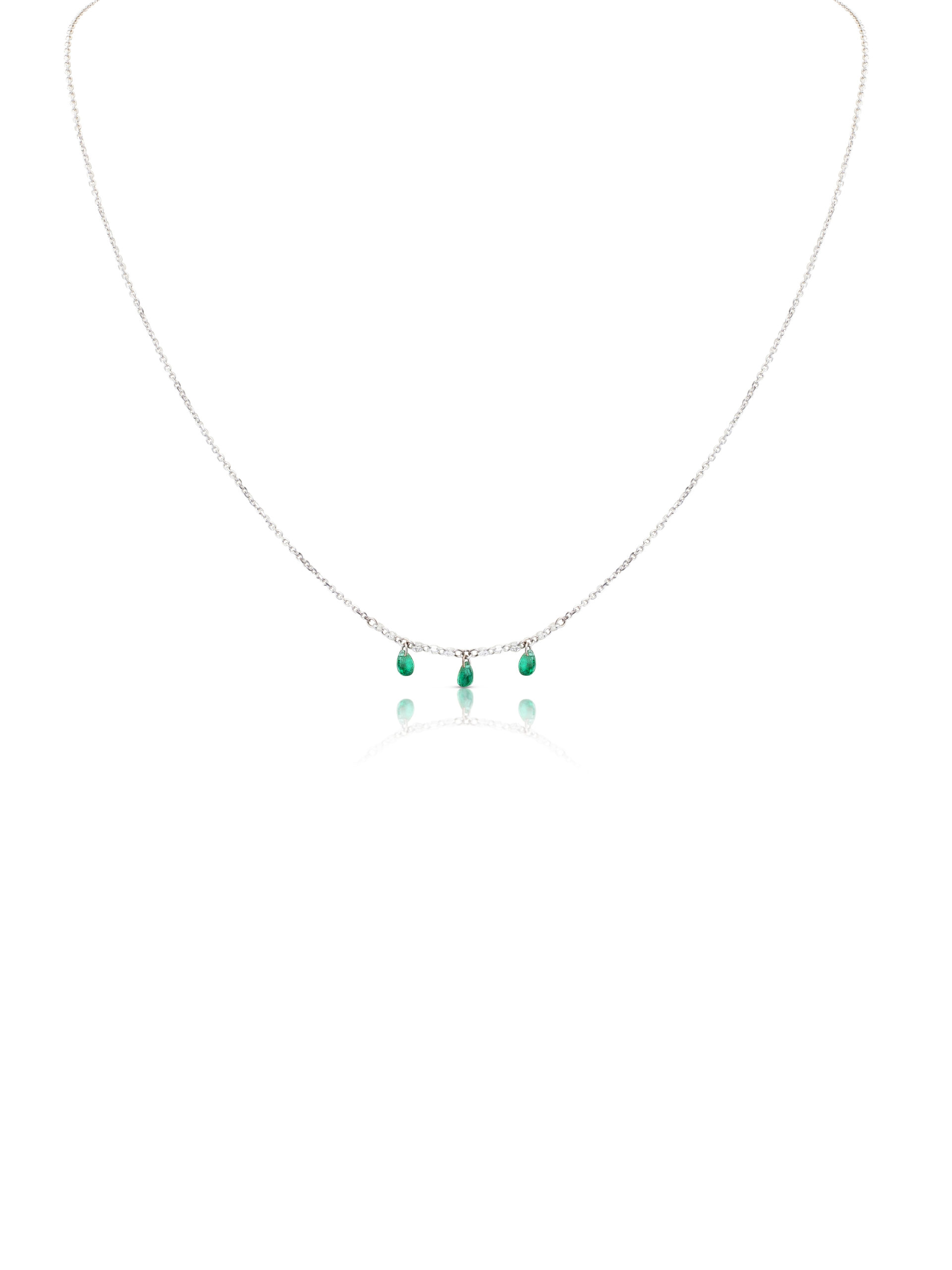 Collana in oro bianco 18KT gr 1,46 con diamanti naturali ct 0,10 e smeraldi naturali taglio goccia ct 0,38
