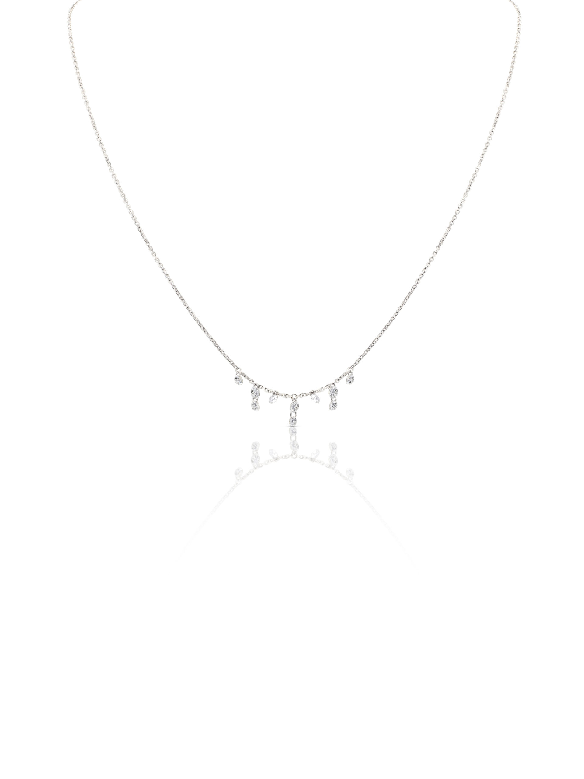 Collana in oro bianco 18KT gr 1,30 con diamanti naturali ct 0,65, 3 diamanti da 10 punti l'uno e 7 da 5 punti l'uno. Colore F Purezza SI. Disponibile in tutte le carature.
