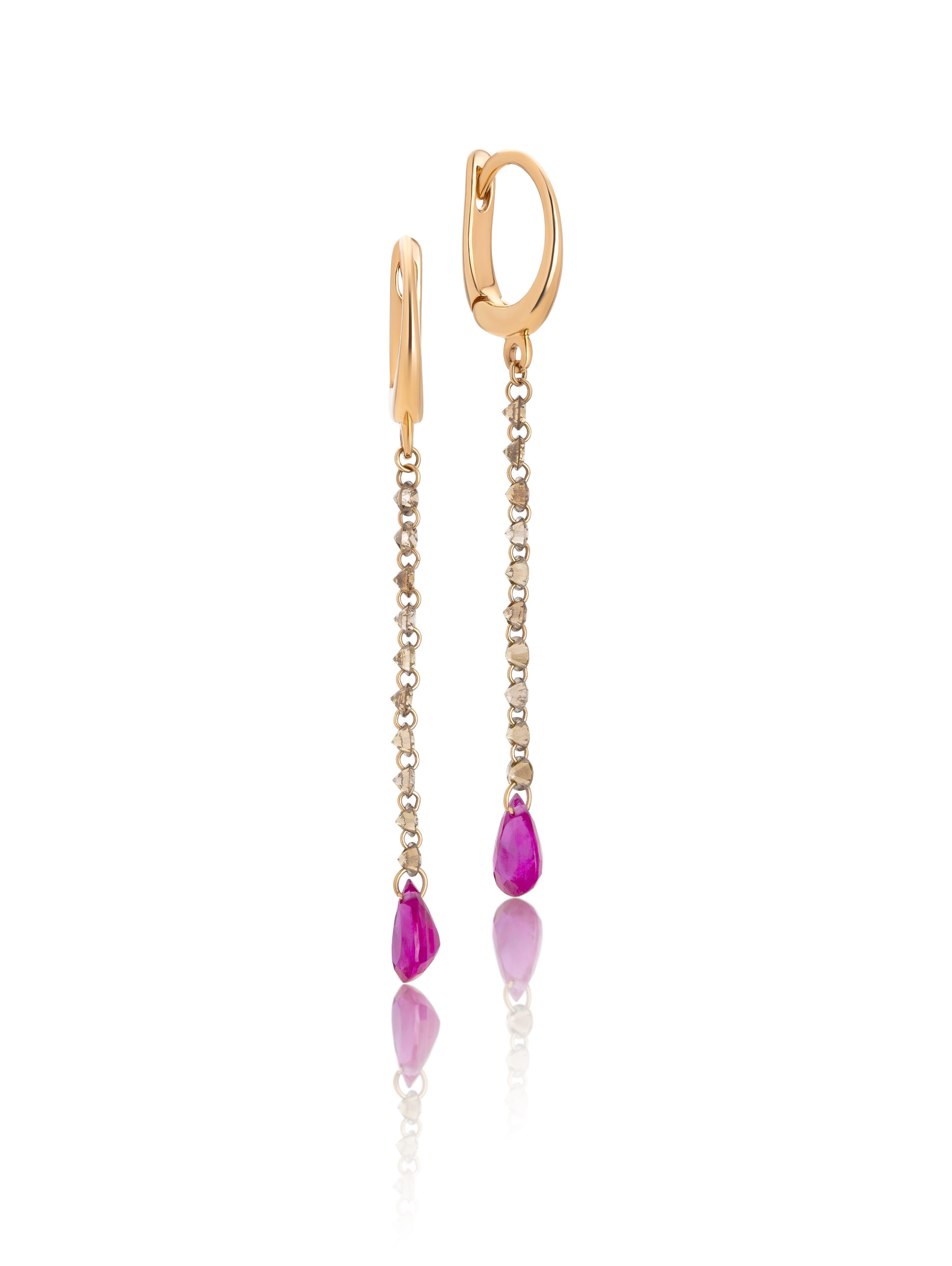 Earrings in 18KT rose gold gr 1,60 with natural brown diamonds ct 0,60 (0,03 points) and natural rubies pear cut ct 0,96.