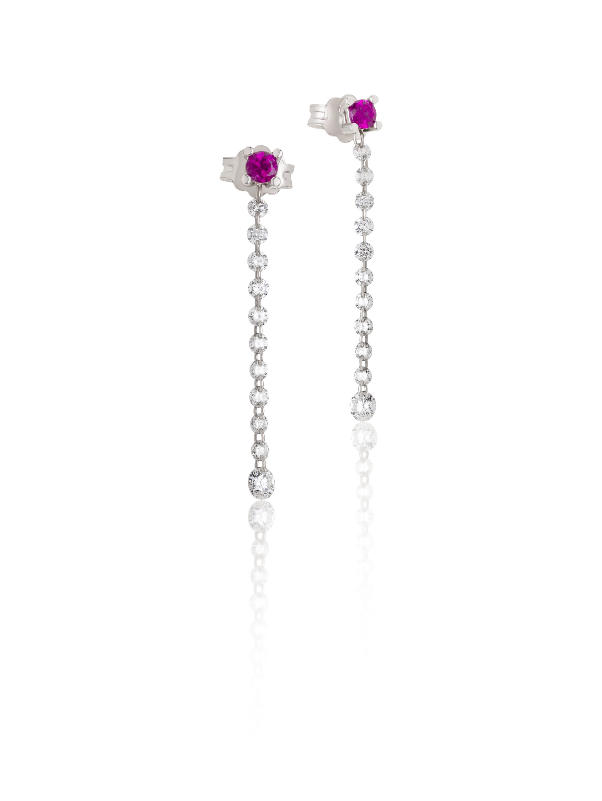 Earrings in 18KT white gold gr 1,12 with natural white diamonds ct 0,68 Color F Purity SI (0,025 points each one) and natural rubies ct 0,25. Available in all carat weights.