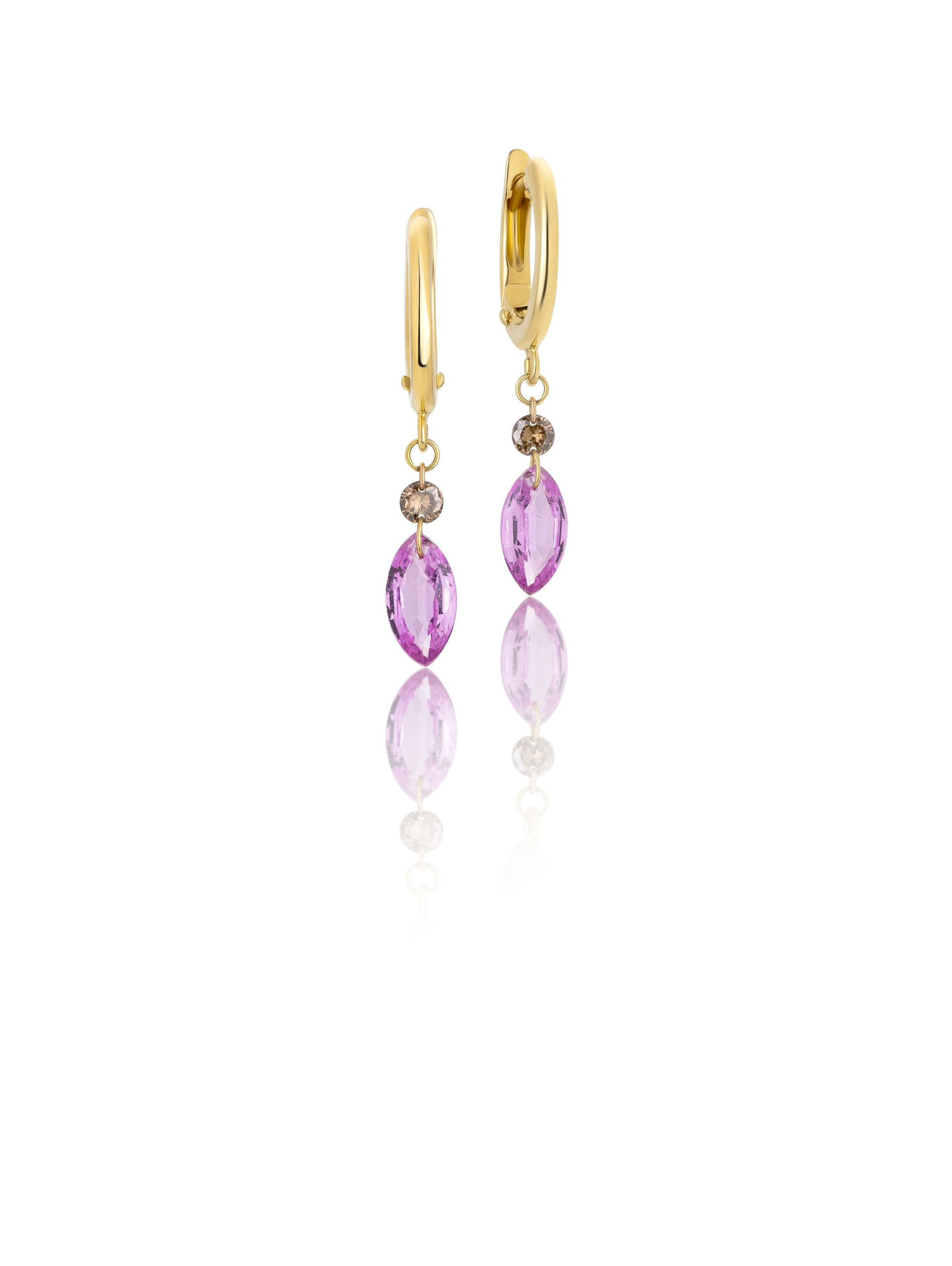 Earrings in 18KT yellow gold gr 2,10 with natural brown diamonds ct 0,10 (0,05 points ) and natural pink sapphires marquise cut ct 1,22.