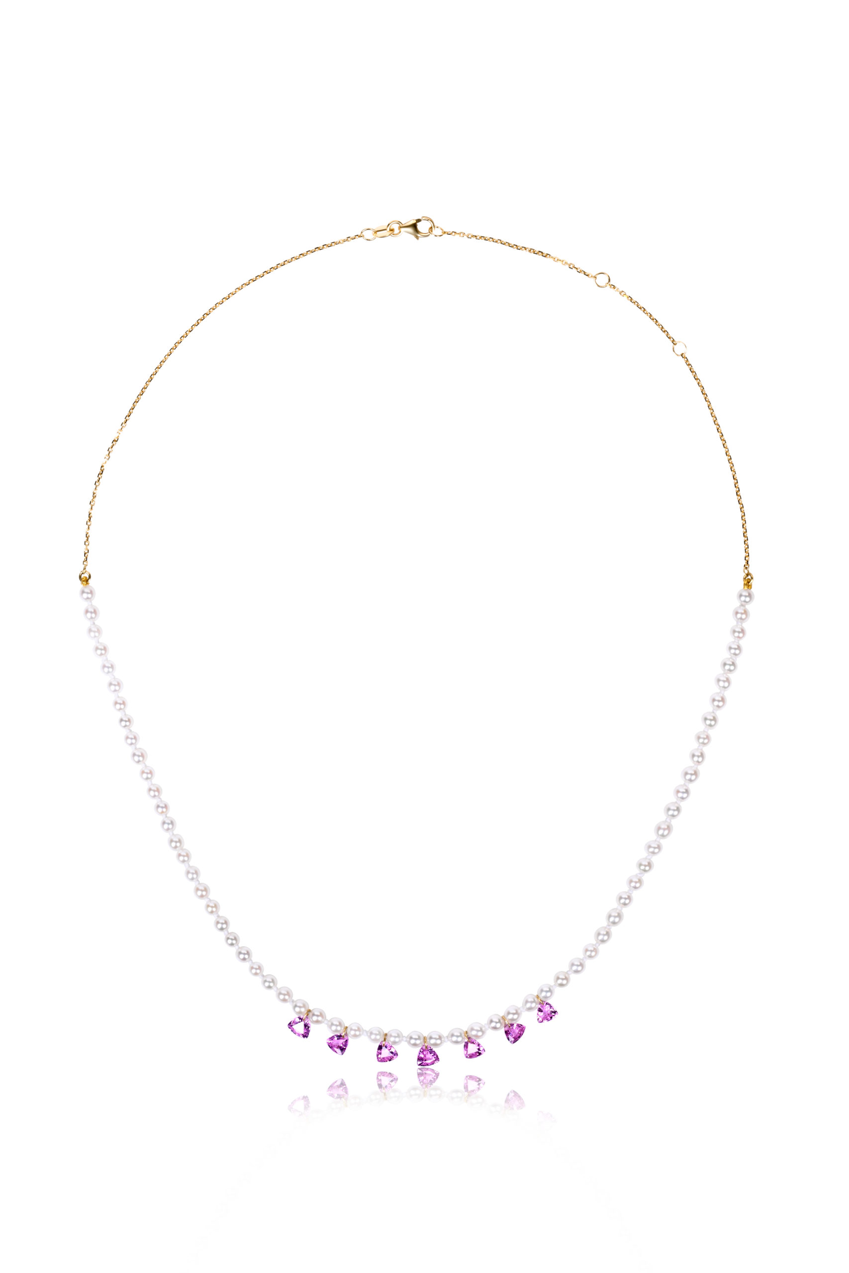 Necklace in 18KT yellow gold gr 1,10 with natural Japanese Akoya Pearls gr 3,72 and natural pink sapphires triangle cut ct 2,84.