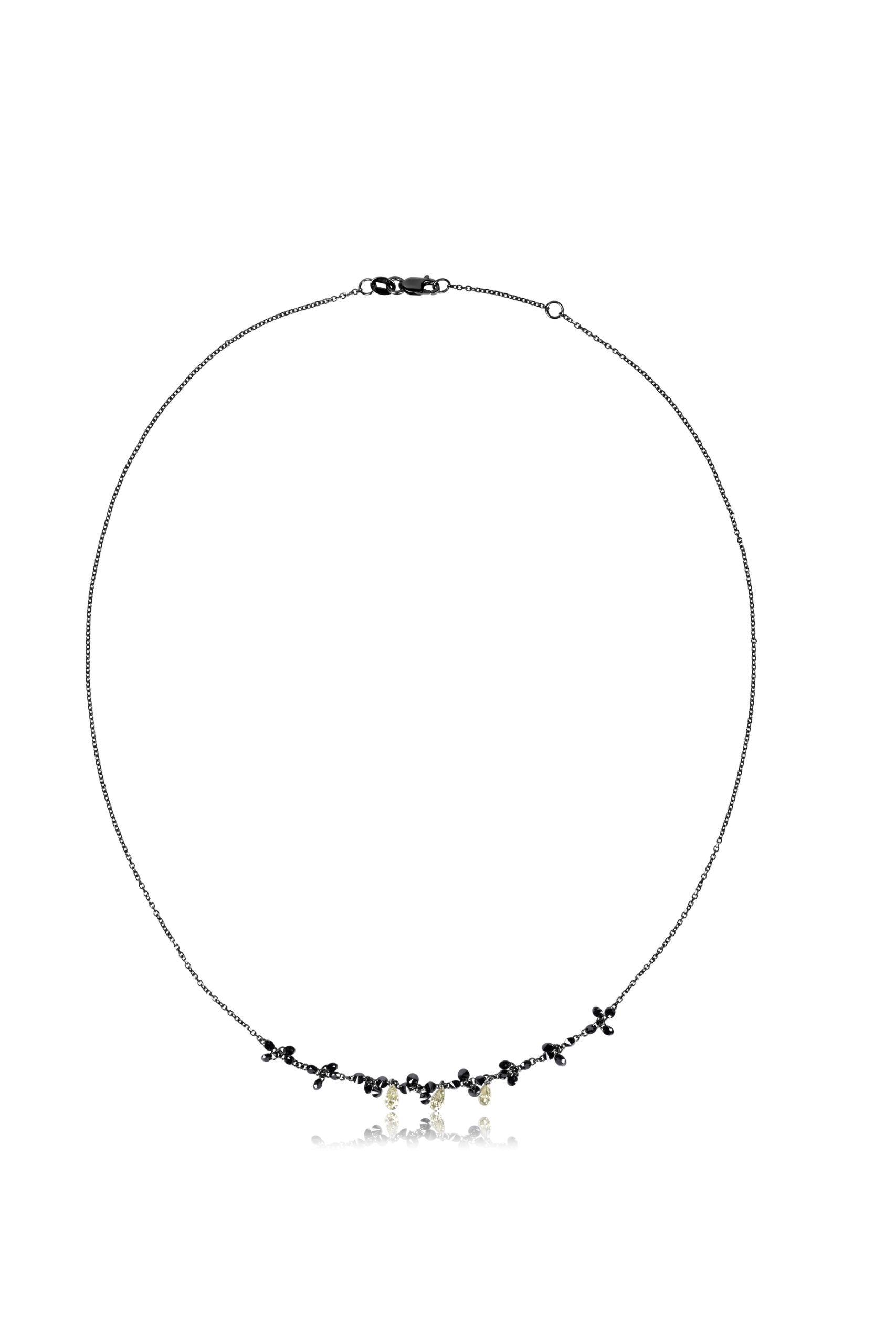 Necklace in black rhodium-plated 18KT gold gr 1,46 with natural black diamonds ct 1,45 (0,04 points each) and fancy natural diamonds pear cut ct 0,45 (0,15 points each ).