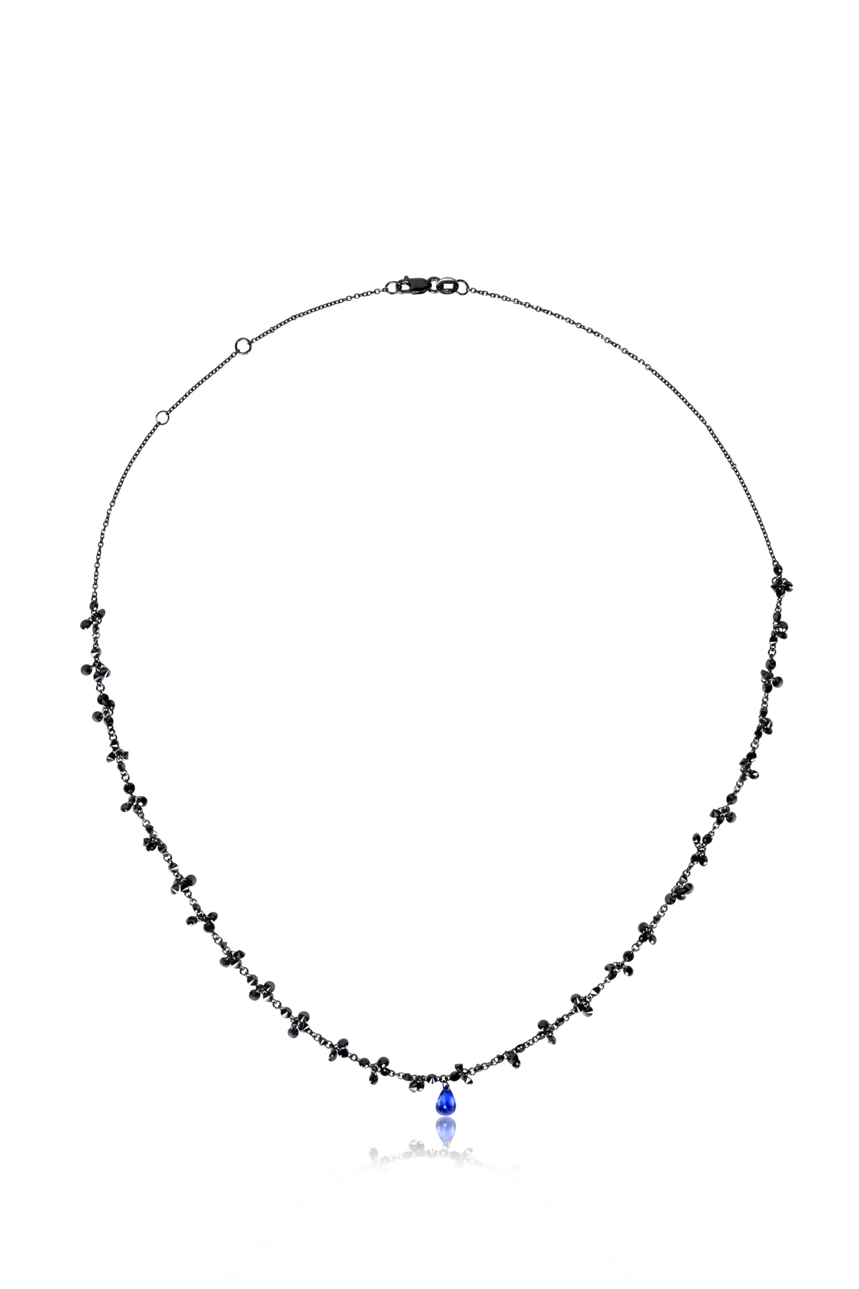 Necklace in black rhodium-plated 18KT gold gr 2,01 with natural black diamonds ct 5,08 (0,04 point each ) and natural blue sapphire pear cut ct 0,52.
